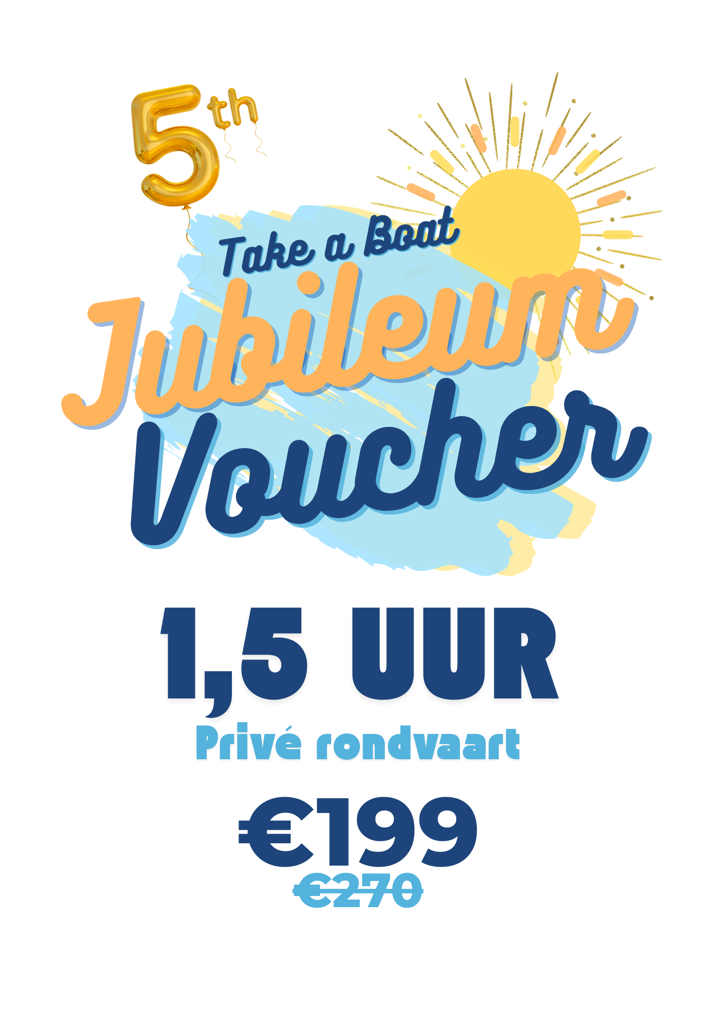 Take a Boat bestaat 5 jaar en dat vieren we graag samen met jou. Wie jarig is trakteert, dus hebben we speciaal voor ons jubileum extra scherpe deals samengesteld. Stap doordeweeks aan boord, geniet op het water en ontdek Rotterdam op z’n mooist. Tijdelijk beschikbaar en in beperkte aantallen dus dit is jouw moment!